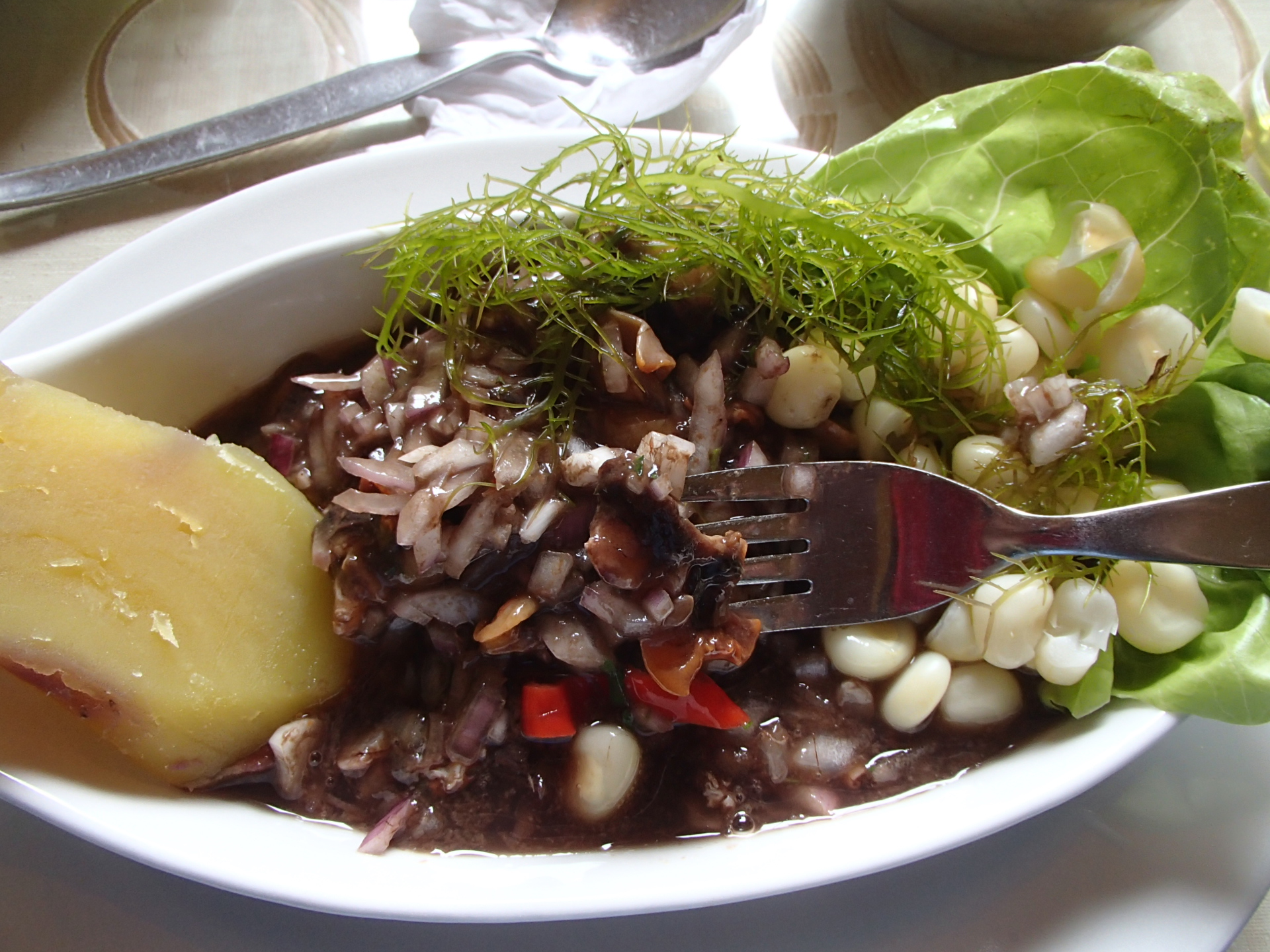 The word “black” forms part of the name for this kind of ceviche. Black, when used in the context of food, is not necessarily a bad thing. Black beans are good. Mesquite-blackened fish at Red Lobster is good. Black Forest chocolate cake is a delight. But black clams, let’s be honest, do not sound good; nor does the picture they present in the mind please in any way whatsoever. When the words “black” and “clam” appear in the name of a dish, there really is nothing that can be done to soften the image. Making this experience even more memorable was that the clams’ room temperature “water” was also dumped into my bowl. Black clam water is dark. Black clam water looks like seepage from a shattered Sharpie. Clam water is raw and unfiltered and contains whatever went into the clam and whatever should have gone out but did not. Black chunks of raw clam soaking in black liquid – I’m not sure I’ll be able to erase this image now hard-wired into my memory. Picture in your mind eating chunks of a child-safe playground surface made from diced car tires marinated in puddled water from the service bay of a gas station in a slum area of a third world nation.