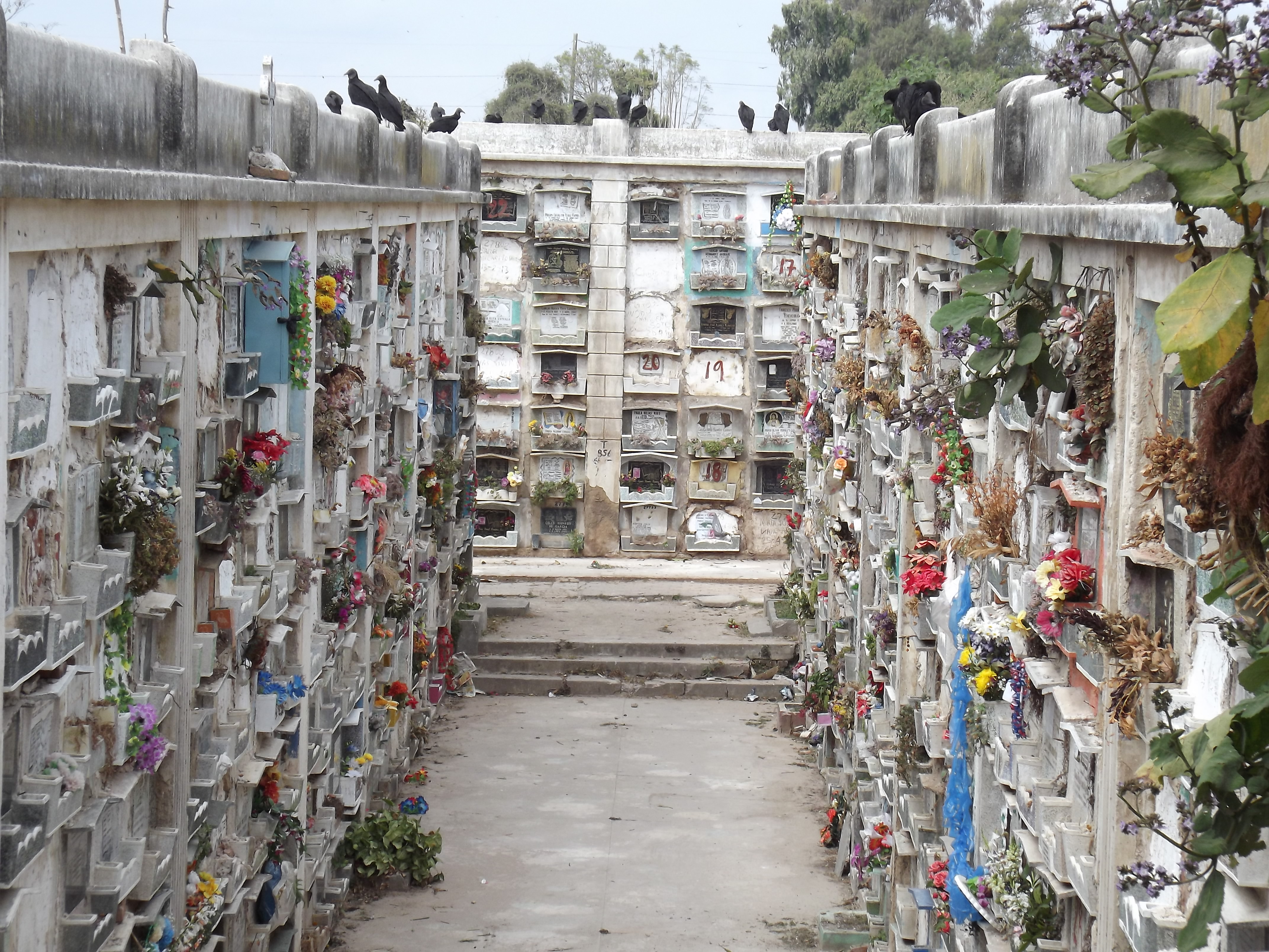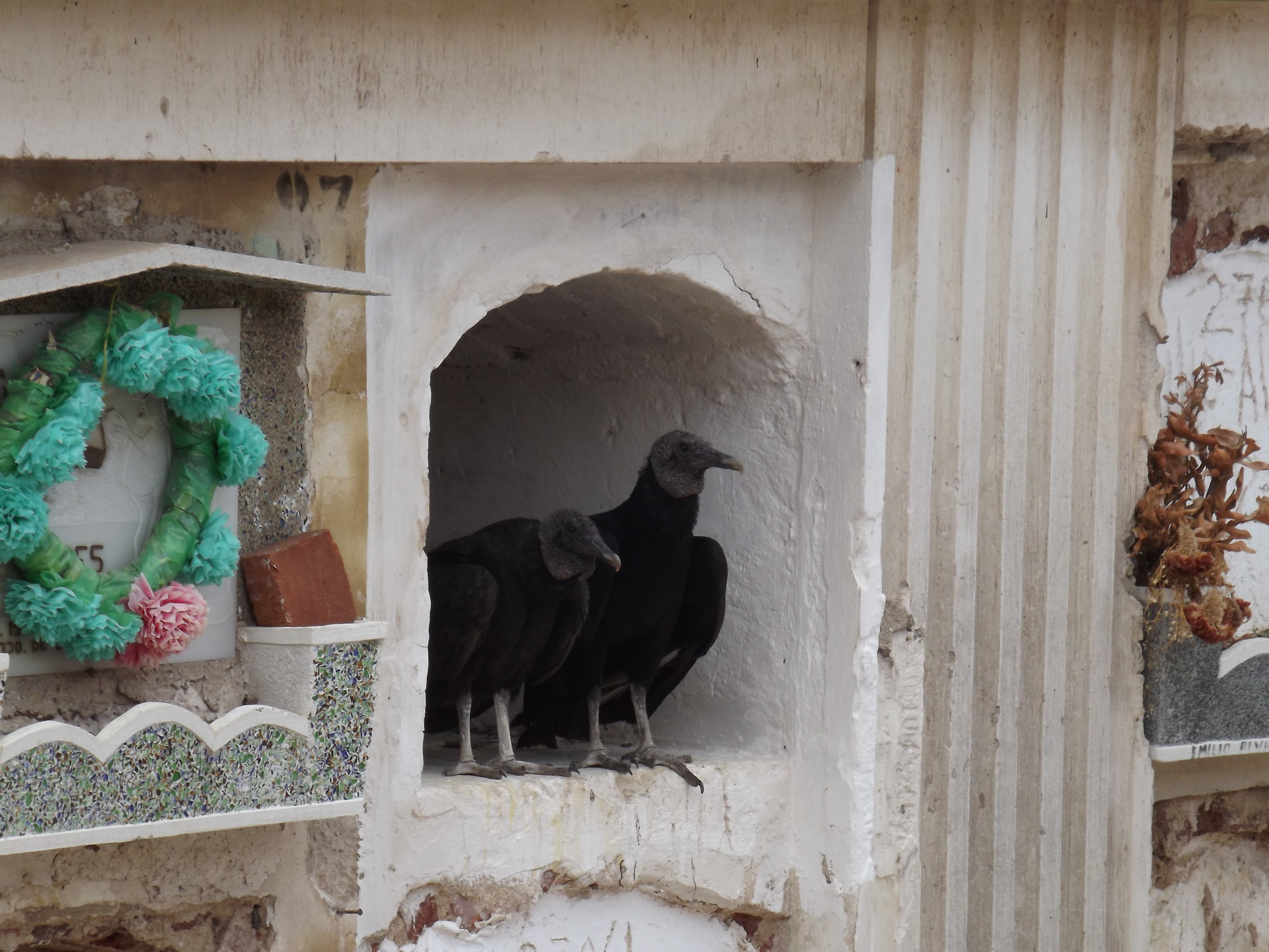 As my wife, another visiting friend, and I looked at and into the coffin, we were surrounded by hundreds of black vultures, some circling in the air above us, some standing on the ground around us, and others perching on top of the hundreds of above ground crypts into which bodies have been laid, stacked eight high in macabre cement “filing cabinets” that surely belong in Count Dracula’s office. The carrion-eating vultures stared at us, probably viewing us as human sashimi, still a bit too fresh to eat, but hoping we would collapse into their next meal. Two of the vultures found refuge in an open crypt and peered at us from the safety of their empty shelter.