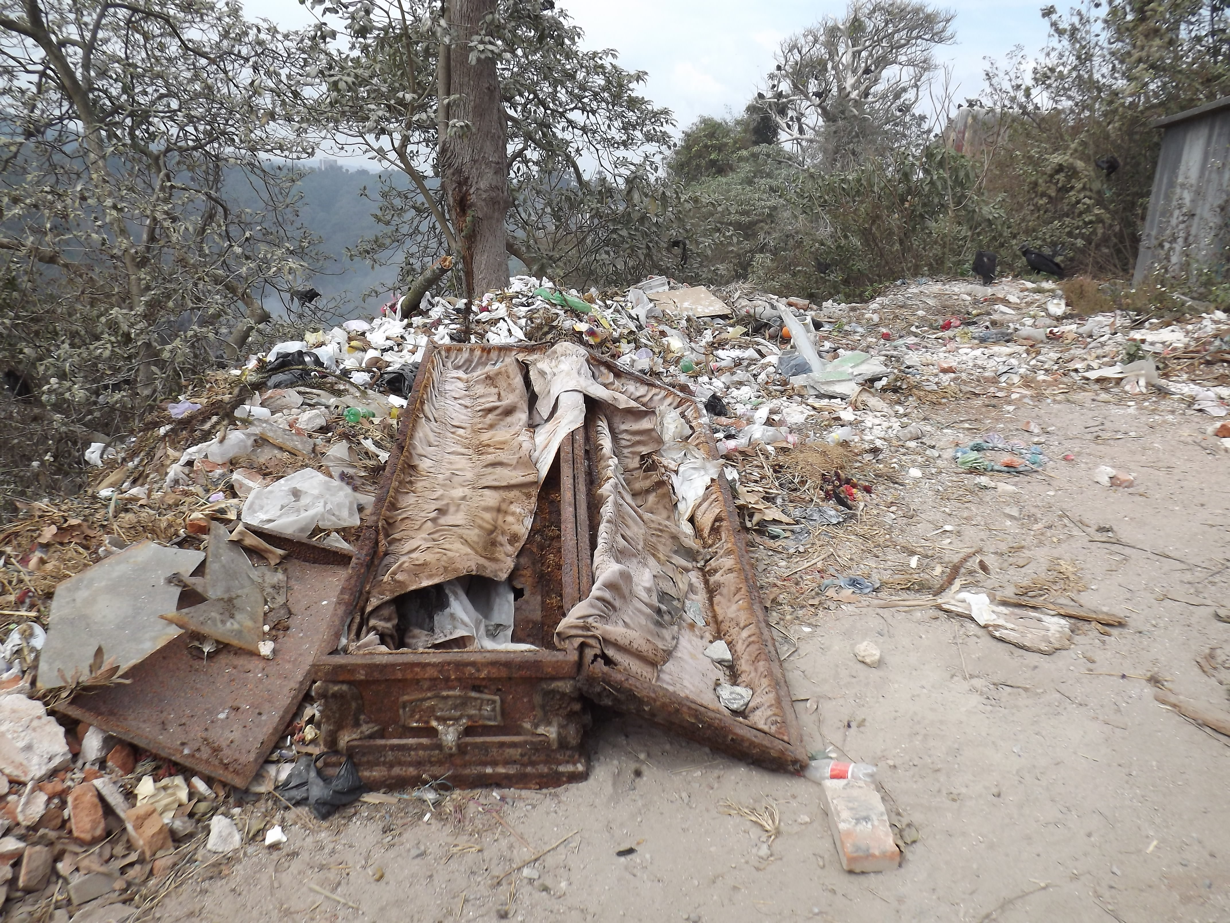 We discovered the coffin last week on a short work trip to Guatemala City. For several years I have been telling my wife about the garbage dump’s “scenic” overlook from the national cemetery in Guatemala City. The unkempt, run-down cemetery is little by little collapsing down the slope into the canyon in which the city dump is located. A decrepit and spooky cemetery, human scavengers wading waist deep through soggy, sour-smelling garbage, hundreds of circling vultures overhead: not even Stephen King could have come up with a setting for a horror novel that approximates the living and very real horror of the Guatemala City dump. Watching people, dogs and vultures competing for scarce resources is true horror, not fictitious entertainment.