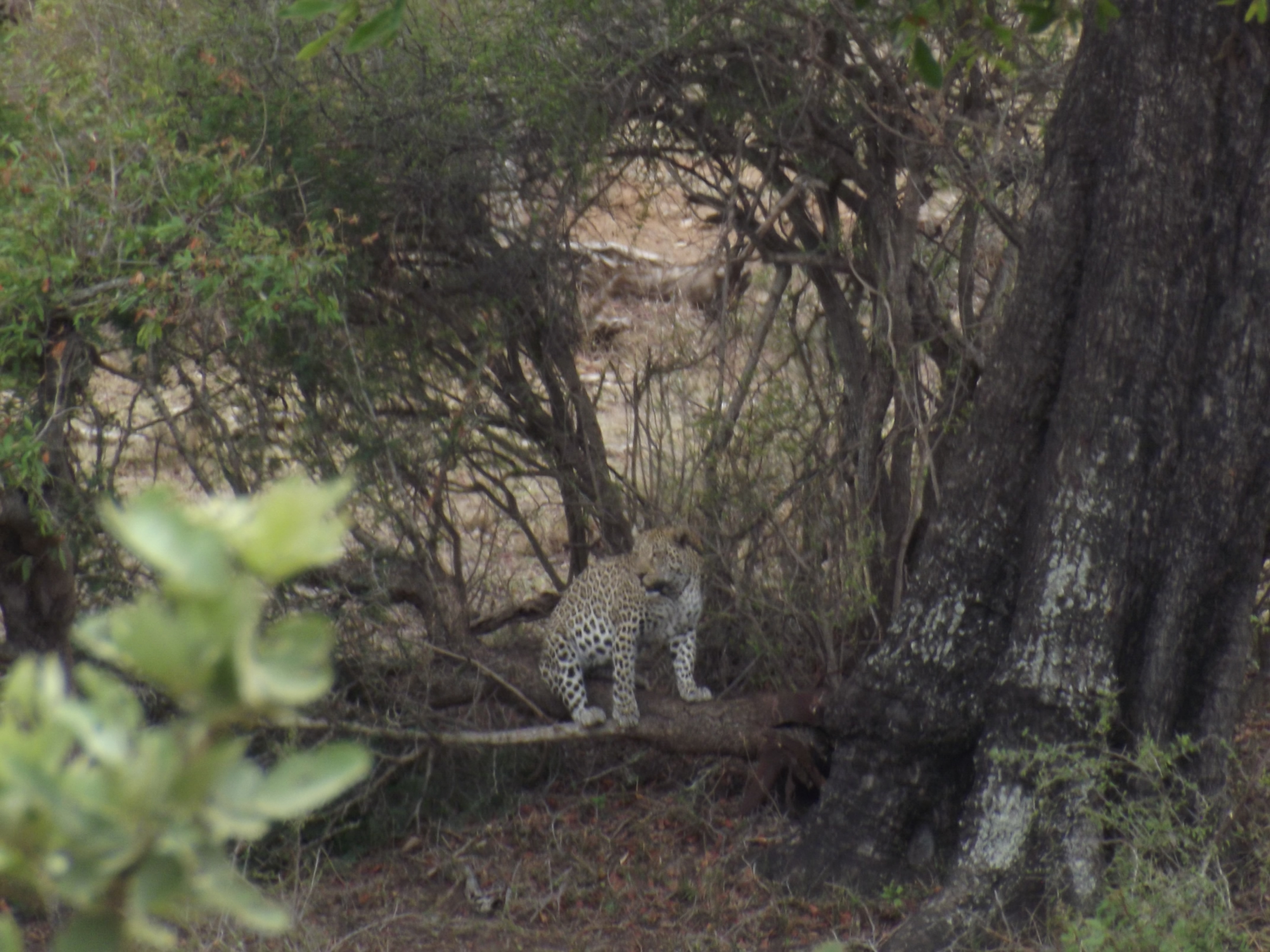Before long we found a drivable trail that led us to a point a little beyond where the giraffes were still looking. We backtracked their line of vision. We saw nothing special. Then suddenly, a slight movement caused a large leopard to magically emerge from his cloak of invisibility. It was the leopard that overwhelmingly commanded the attention of the giraffes, causing them to ignore us humans.